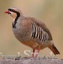 This partridge has well marked black and white bars on the flanks and a black band running from the forehead across the eye and running down the head to form a necklace that encloses a white throat. The species has been introduced into many other places and feral populations have established themselves in parts of North America and New Zealand.