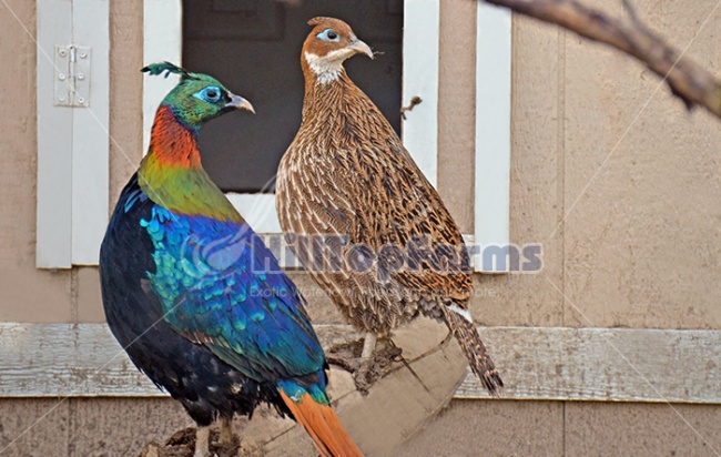 The males are adorned with beautiful metallic colors of green, purple, red and blue; they also have a large white patch on the rump. The breast and underparts are black and the tail is copper.The males also have a very long crest, much like a peacock. The male also has a bare patch of turquoise blue skin around the eye.The hens, while much duller than the male, are still attractive. They are basically mottled brown overall, with black, buff and white streaks. Her throat is white and she has a short crest. Hens also have the blue patch around the eyes. First year males resemble the hens, but are larger and have black feathers on the neck and breast.  These photographs are taken from our own farm and are not edited. They are available in JPEG format. The image you get after buying will be in 300 dpi with dimension 4168 x 2646. The images will not be watermarked.  Hilltop Farm is located on top of one of the many beautiful hills in La Fayette, NY, and part of the Finger Lakes Region of NY. Both Otisco and Skaneateles Lakes are only minutes away from our farm. At HillTop Farm, we raise a variety of pheasants, waterfowls, peafowls, parrots, pigeons and chickens. We sell eggs, adult birds and breeders when available.
