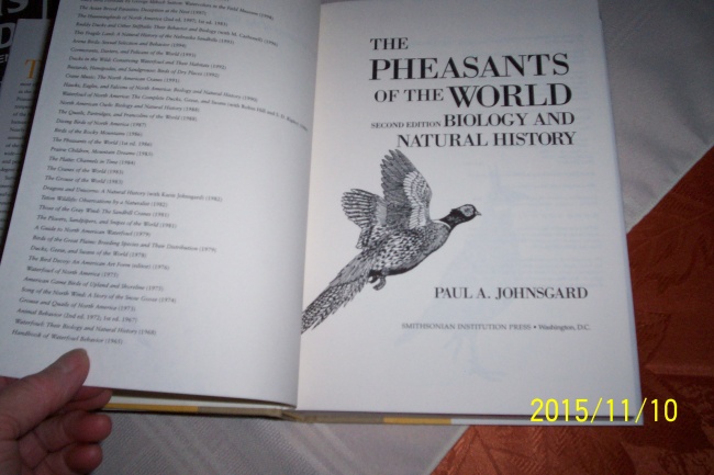 I keep a copy of this book in my library. It is the book I go to first when I want to know where a bird is from, how big a clutch the hen will lay etc. Book: The Pheasants of The World, by Paul A. Johnsgard Biology and Natural History Second Edition 1999