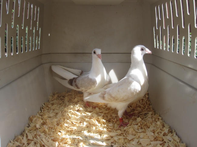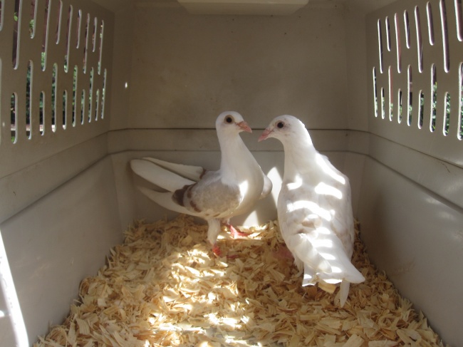 This is a red bar saddle and yellow dilute saddle. The two are NOT nest mates   They're a pretty good size now, but will develop muscle and fill out more as they age.  Very good and hardy birds, great for any pigeon breeder of any level.  I am selling these together. They are both AU banded with 2012 bands. They are between 6-8 weeks of age. I will ship the the following Monday after receiving payment, weather permitting (will not ship in very cold weather)   Shipping is at the buyer's expense (cost of box + plus USPS fee)  pedigrees available at additional fee Please feel free to contact me if you have any additional questions.  |